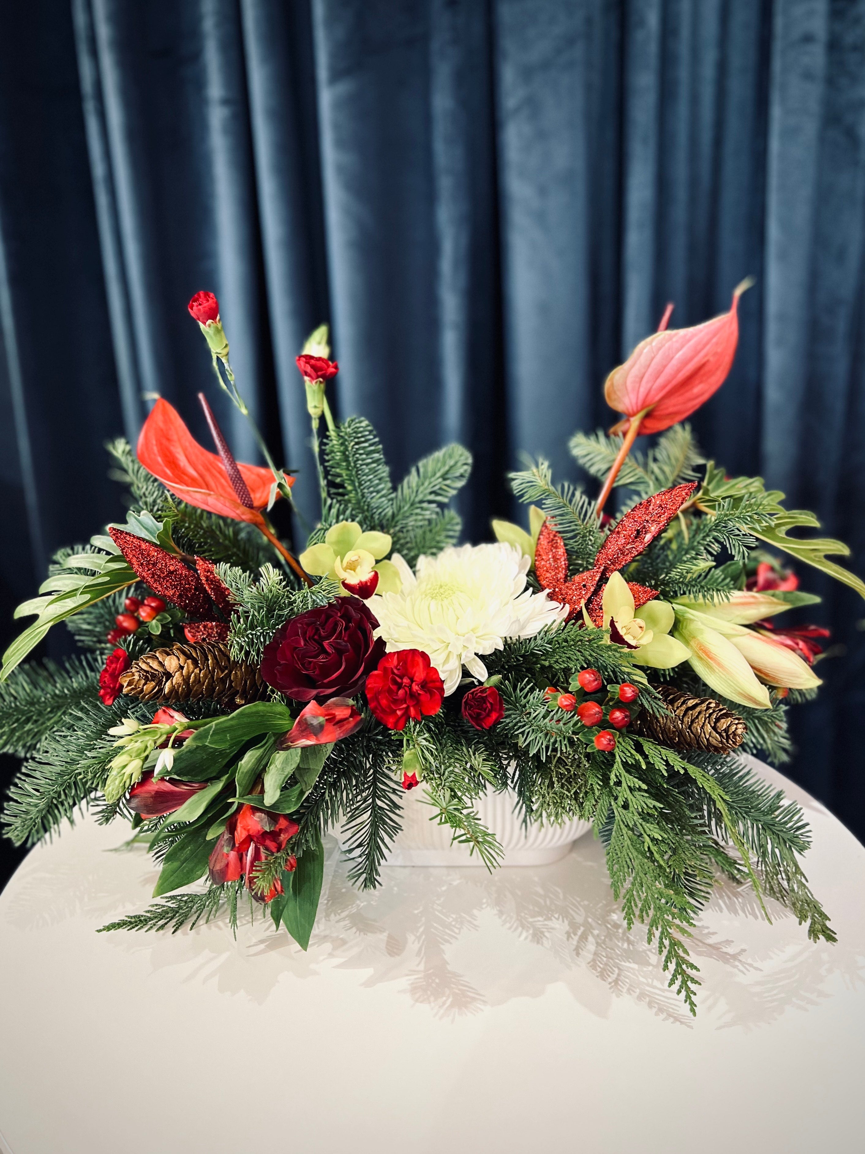 Overflowing with all the fixings including amaryllis, berries, pinecones, orchids, anthurium, roses, and sparkle to boot! Low enough to serve as a centerpiece or mantle arrangement! Starting delivery the week of December 15
