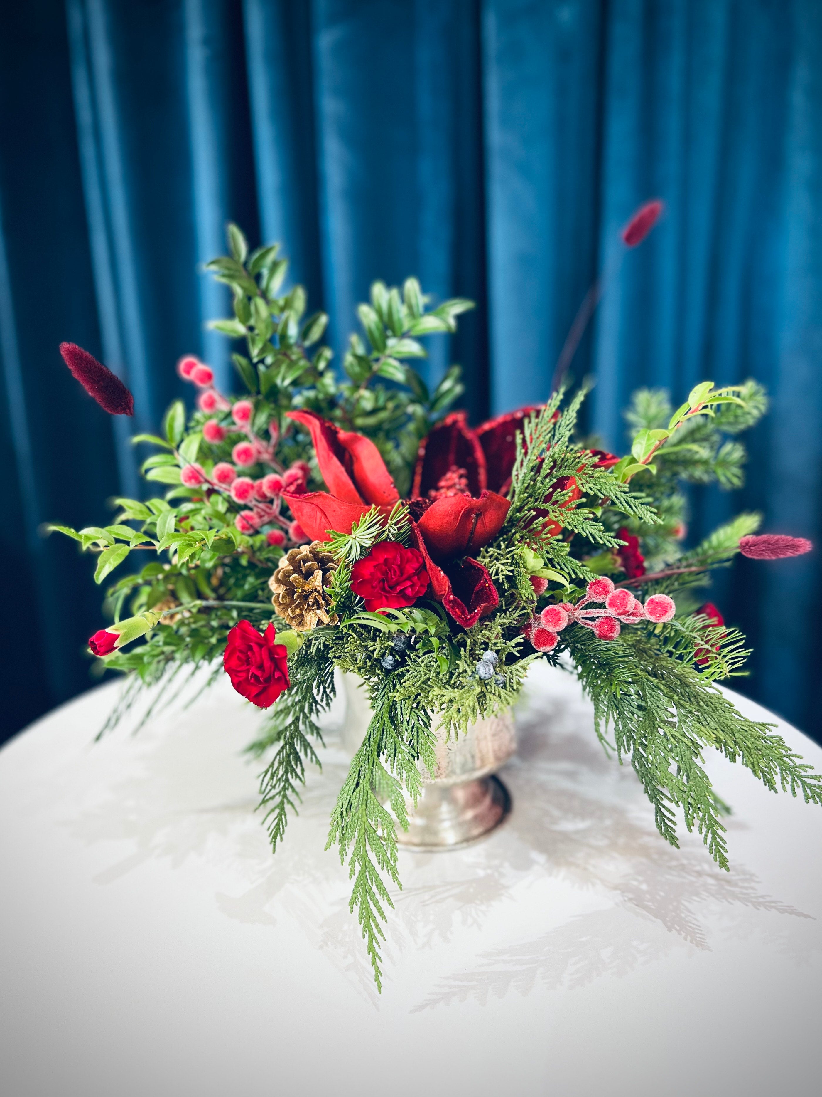 Bring a touch of elegance to your home or Christmas setting with this lovely arrangment! Comes in a silver metallic vessel and is low enough to serve as a centerpiece or about anywhere you want some holiday cheer!